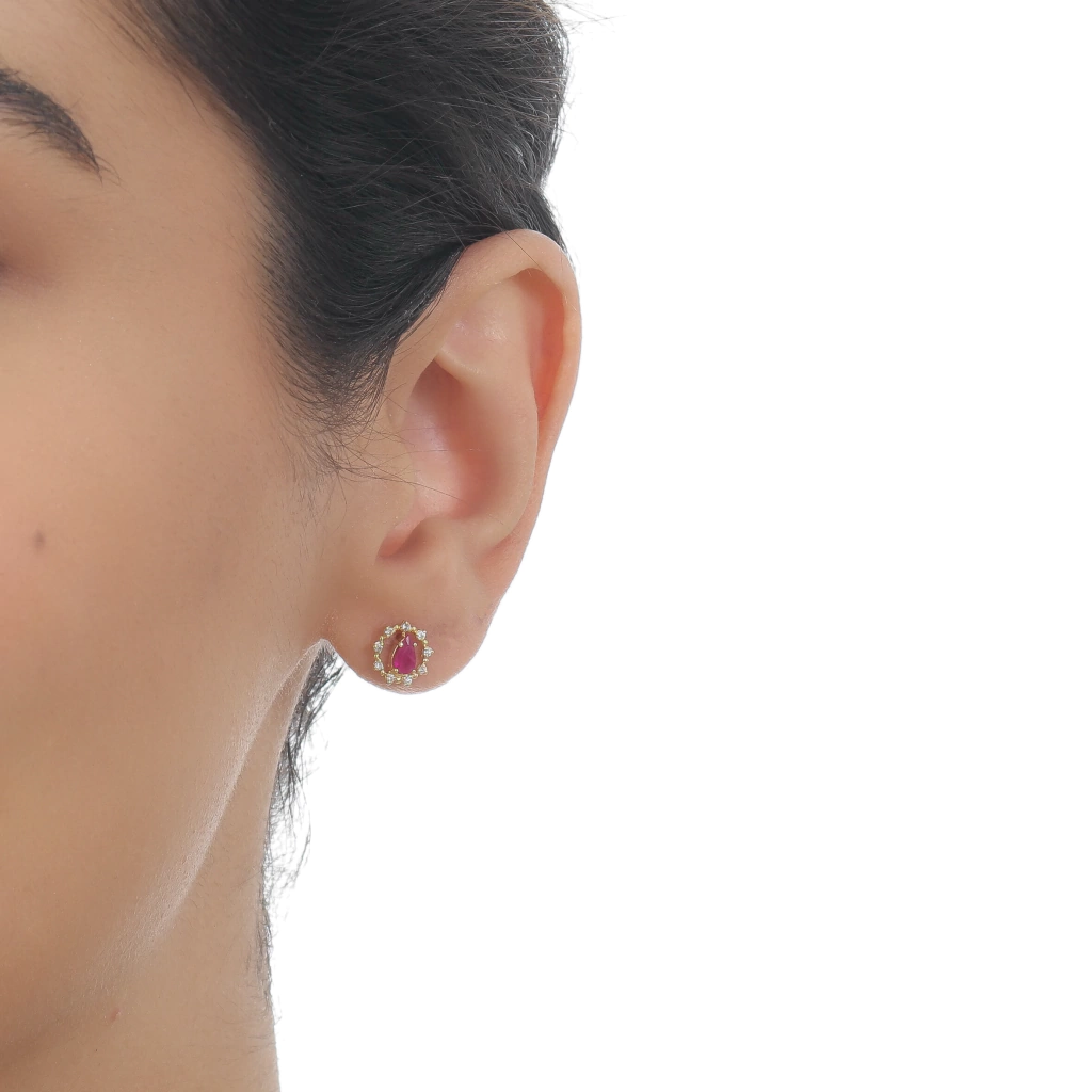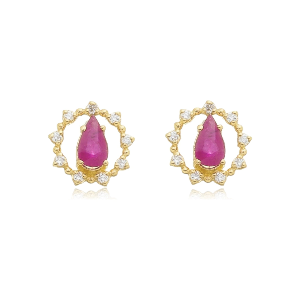 Este brinco é feito em Ouro Amarelo 18K, com uma gota de Rubi no centro da peça com 9 Diamantes de 1 pts cravejados em um círculo vazado de ouro ao redor do Rubi!