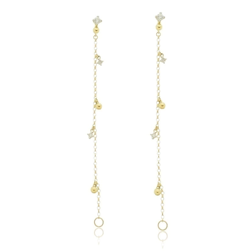 O Brinco Pólen é feito em Ouro Amarelo 18K, possui uma corrente portuguesa de aproximadamente 6 cm, com um diamante cravejado na base e dois diamantes ao longo da corrente. Na ponta da corrente há uma argola, que permite que você use o brinco solto ou preso na base.
